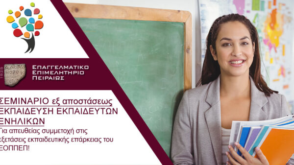Το Επαγγελματικό Επιμελητήριο Πειραιώς υλοποιεί ΣΕΜΙΝΑΡΙΟ «ΕΚΠΑΙΔΕΥΣΗ ΕΚΠΑΙΔΕΥΤΩΝ ΕΝΗΛΙΚΩΝ», ΓΙΑ ΑΠΕΥΘΕΙΑΣ ΣΥΜΜΕΤΟΧΗ ΣΤΙΣ ΕΞΕΤΑΣΕΙΣ ΕΚΠΑΙΔΕΥΤΙΚΗΣ ΕΠΑΡΚΕΙΑΣ ΤΟΥ ΕΟΠΠΕΠ. Το πρόγραμμα στοχεύει στην ουσιαστική προετοιμασία υποψηφίων εκπαιδευτών ενηλίκων για τις εξετάσεις πιστοποίησης εκπαιδευτικής επάρκειας του ΕΟΠΠΕΠ (Εθνικού Οργανισμού Πιστοποίησης Προσόντων και Επαγγελματικού Προσανατολισμού).