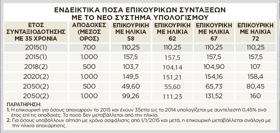 Για να πάρουν ένα κάπως ανεκτό ποσό επικουρικής της τάξης των 180 ευρώ, οι ασφαλισμένοι θα πρέπει να υποβάλουν αίτηση ακόμη και στα 72, ενώ αν θέλουν να πάρουν 245 ευρώ από το νέο σύστημα που ισχύει μετά την 1/1/2015, τότε θα πρέπει να ζήσουν και να πληρώνουν εισφορές ως τα 80 τους χρόνια!
