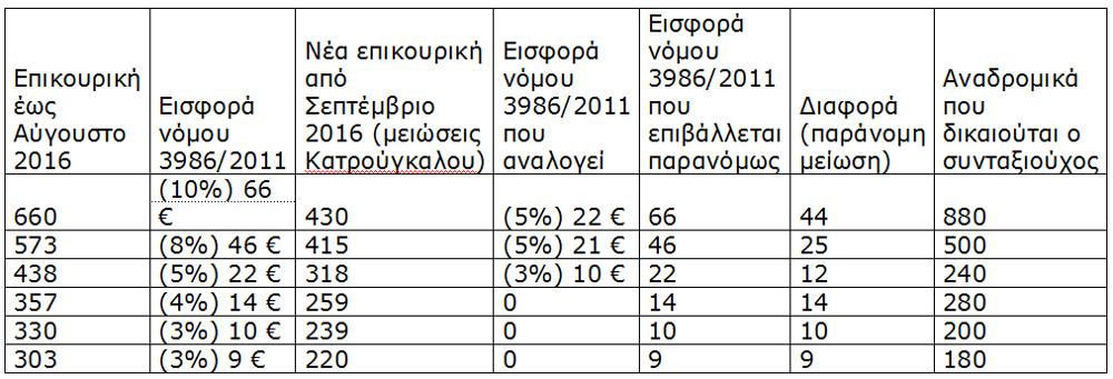 1 Τον Αύγουστο του 2016 γίνεται επανυπολογισμός και η νέα μικτή επικουρική (αναπροσαρμοσμένη βασική επικουρική σύνταξη) βγαίνει στα 232,7 ευρώ. Δεν επιβάλλεται μείωση ν. 3986, γιατί είναι κάτω από 300 ευρώ. Το καθαρό ποσό σύνταξης όμως είναι στα 182,37 ευρώ, δηλαδή πιο πάνω από το παλιό καθαρό των 178,38 ευρώ, γιατί μετά τον επανυπολογισμό έφυγαν όλες οι άλλες μνημονιακές κρατήσεις και έμειναν μόνον η εισφορά ασθένειας και ο φόρος.