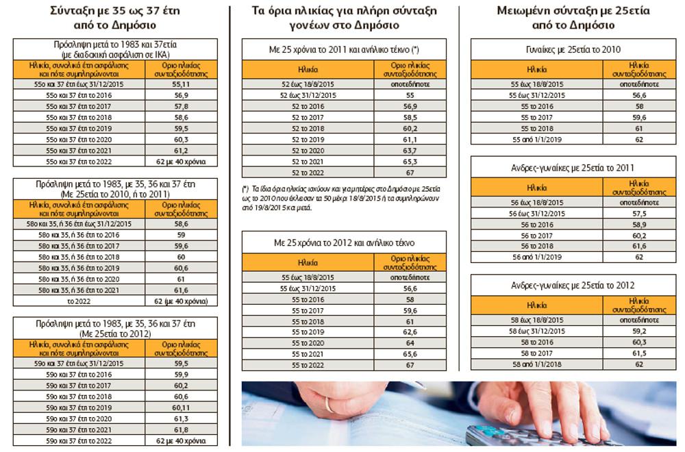 2. Γονείς με ανήλικο τέκνο και με 25ετία τα έτη 2011 και 2012. Είχαν όριο ηλικίας για σύνταξη τα 52 και τα 55. Αν πιάνουν τις ηλικίες αυτές από 19/8/2015 μέχρι το 2017 αποχωρούν σε ηλικίες από 55 ως 59,5 ετών. Ενώ όσοι κλείσουν τα 52 ή τα 55 από το 2018 ως το 2022 βγαίνουν στη σύνταξη από 60,2 ως 67 ετών.