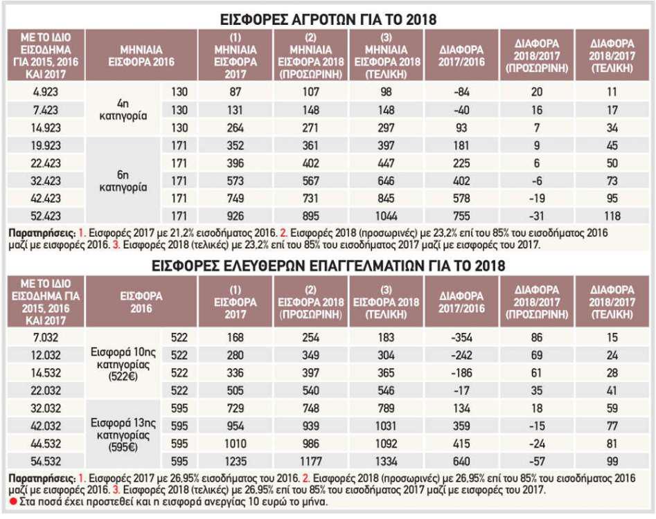 1. Οι εισφορές των αγροτών θα έχουν αύξηση 13% για το 2018, ακόμη και με το ίδιο εισόδημα για το 2015, 2016, 2017. Αν όμως έχει αυξηθεί το εισόδημα η εισφορά υπερδιπλασιάζεται! Για παράδειγμα, αγρότης που πλήρωνε το 2016 εισφορά 4ης κατηγορίας, δηλαδή 130 ευρώ το μήνα, ή 1.561 ευρώ ετησίως, και είχε εισόδημα έως 4.923 ευρώ (για 2015-2017), θα καταβάλλει από 1/1/2018 προσωρινή μηνιαία εισφορά 107 ευρώ, ενώ το 2017 πλήρωνε 87 ευρώ. Η εισφορά του 2018 θα υπολογιστεί με βάση το εισόδημα των 4.923 ευρώ συν τα 1.561 ευρώ της εισφοράς του 2016, ήτοι σε «εισόδημα» 6.484 ευρώ, το οποίο μετά την έκπτωση 15% διαμορφώνεται σε 5.511 ευρώ. Επί αυτού του εισοδήματος, ο αγρότης θα πληρώσει εισφορά 23,2%, ήτοι 1.279 ευρώ το χρόνο, ή 107 ευρώ το μήνα. Ακολούθως θα βγει η τελική εισφορά του 2018, όταν θα δηλωθεί και εκκαθαριστεί το εισόδημα του 2017. Η τελική εισφορά θα είναι 1.176 ευρώ το χρόνο, ή 98 ευρώ το μήνα με αύξηση 12,8% σε σύγκριση με το 2017. Αν είχε εισόδημα 4.923 ευρώ το 2016 και αυξήθηκε στα 14.923 ευρώ το 2017, τότε η προσωρινή του εισφορά θα είναι 107 ευρώ αλλά η τελική θα πάει στα 297 ευρώ μετά το β’ εξάμηνο του 2018 με αύξηση κατά 218% από το 2017!