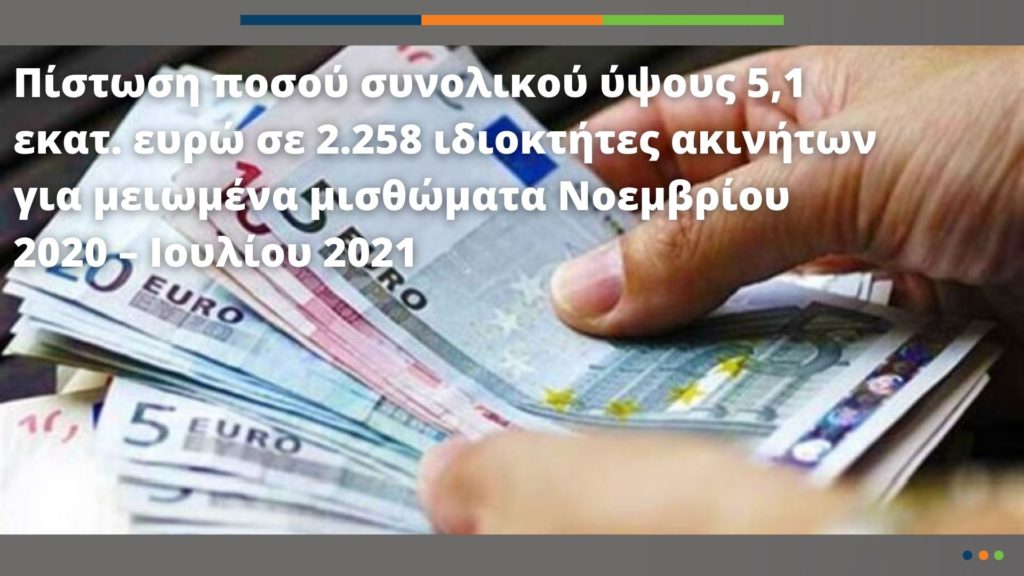 Το Υπουργείο Οικονομικών προχώρησε την Παρασκευή 1η Ιουλίου στην καταβολή ποσού συνολικού ύψους 5.101.702,88 ευρώ, σε 2.258 ιδιοκτήτες ακινήτων (μοναδιαίους Α.Φ.Μ.), επιλύοντας εκκρεμότητες για μειωμένα μισθώματα της περιόδου Νοεμβρίου 2020 – Ιουλίου 2021. Ειδικότερα, πιστώθηκαν στους τραπεζικούς λογαριασμούς: