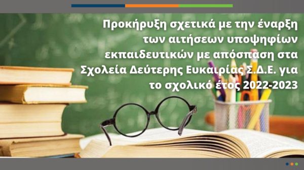 Προκήρυξη σχετικά με την έναρξη των αιτήσεων υποψηφίων εκπαιδευτικών με απόσπαση στα Σχολεία Δεύτερης Ευκαιρίας Σ.Δ.Ε. για το σχολικό έτος 2022-202329 Απρ 2022