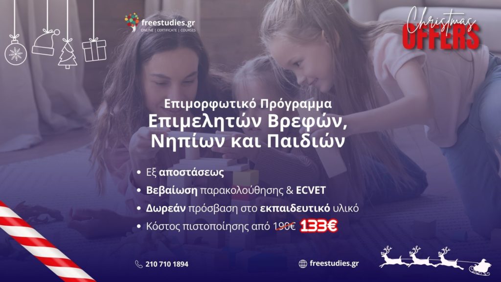 Τα Ελληνικά Κέντρα Δια Βίου Μάθησης (ΕΛ.ΚΕ.ΔΙ.Μ.) ανακοινώνουν την έναρξη του Επιμορφωτικού εξ αποστάσεως Σεμιναρίου με τίτλο: «Επιμορφωτικό Πρόγραμμα Επιμελητών Βρεφών, Νηπίων και Παιδιών», το οποίο προσφέρει τις απαιτούμενες γνώσεις και δεξιότητες για τη φροντίδα και τη φύλαξη βρεφών, νηπίων και παιδιών. Απώτερος στόχος του είναι η επιμόρφωση και η ενίσχυση των γνώσεων και δεξιοτήτων εκείνων που θα επιμελούνται τη φροντίδα βρεφών, νηπίων και παιδιών.