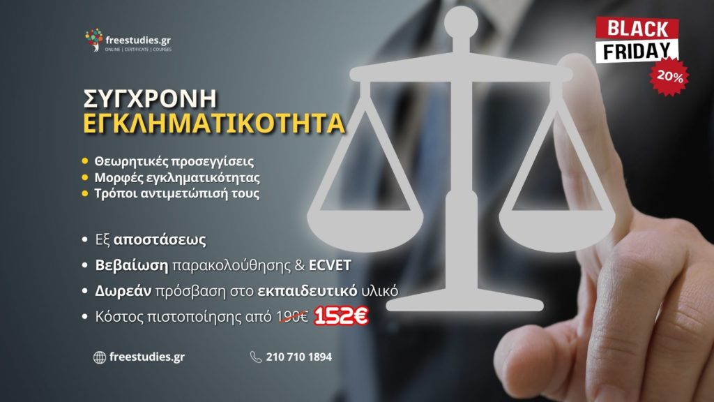 Το Πρόγραμμα Εξειδίκευσης «Η σύγχρονη εγκληματικότητα. Θεωρητικές προσεγγίσεις, μορφές εγκληματικότητας και τρόποι αντιμετώπισή τους» που προσφέρουν τα Ελληνικά Κέντρα Δια Βίου Μάθησης (ΕΛ.ΚΕ.ΔΙ.Μ.), απευθύνεται σε όσους επιθυμούν να ασχοληθούν σε βάθος με τις σύγχρονες μορφές εγκληματικότητας καθώς και με τους τρόπους αντιμετώπισής τους .