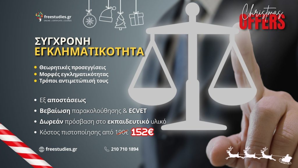 Το Πρόγραμμα Εξειδίκευσης «Η σύγχρονη εγκληματικότητα. Θεωρητικές προσεγγίσεις, μορφές εγκληματικότητας και τρόποι αντιμετώπισή τους» που προσφέρουν τα Ελληνικά Κέντρα Δια Βίου Μάθησης (ΕΛ.ΚΕ.ΔΙ.Μ.), απευθύνεται σε όσους επιθυμούν να ασχοληθούν σε βάθος με τις σύγχρονες μορφές εγκληματικότητας καθώς και με τους τρόπους αντιμετώπισής τους .
