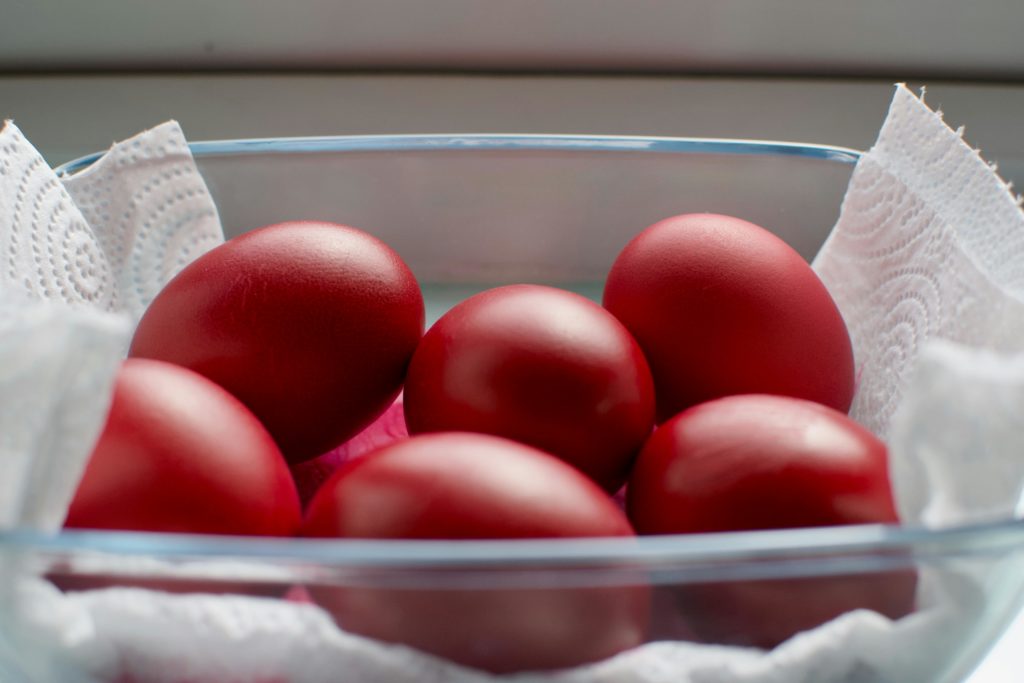 Την Μεγάλη Πέμπτη ή Κοκκινοπέφτη βάφουν το πρωί τα αβγά, βάζουν το πρώτο αβγό-παλιότερα πρόσεχαν να είναι μαύρης κότας- στο εικονοστάσι και πετούν το παλιό στο ποτάμι ή παλιότερα το κρατούσαν επτά χρόνια για να γίνει ο κρόκος του σαν κεχριμπάρι, φυλαχτό για τις έγκυες γυναίκες (κρατητήρα). Με το πρώτο αβγό σταύρωναν τα παιδιά, όταν ήταν άρρωστα. Και ο αριθμός των αβγών πρόσεχαν να είναι ορισμένος, το δοχείο να είναι καινούργιο και το νερό με τη μπογιά να μη χυθεί ή βγει από το σπίτι. Ιδιαίτερη δύναμη πίστευαν ότι είχαν τα «ευαγγελισμένα» αβγά, αυτά δηλαδή που παρέμεναν στην εκκλησία μέχρι την Ανάσταση. Τα τσόφλια από τα ευαγγελισμένα αβγά τα έβαζαν στον κήπο, στις ρίζες των δένδρων για να «πιάσουν όλοι οι καρποί». Το πρώτο αβγό το έθαβαν στην πρώτη αυλακιά, όταν άρχιζαν να σπέρνουν για να είναι καθαρό το σιτάρι σαν το αβγό, αλλά και για να βλαστήσει ο σπόρος. Τα αβγά τα έβαφαν με μπακάμι, με ριζάρι, φύλλα από κρεμμύδια κλπ. Σήμερα, βάφονται με μπογιές του εμπορίου και ξίδι. Τα κεντούσαν ή τα ζωγράφιζαν με φύλλα, κρεμμυδόφυλλα, ζυμάρι, λειωμένο κερί κλπ. Σύμφωνα με μια παράδοση «Όταν αναστήθηκεν ο Χριστός, τό ’παν σε μιά χωρική κι αυτή δεν πίστεψε και είπεν: Όταν τ’ αβγά γίνουν κόκκινα, τότε θ’ αναστηθή και ο Χριστός. Και αυτά κοκκίνησαν. Και από τότε τα βάφουν κόκκινα» (Καστοριά). Άλλη παράδοση αναφέρει ότι βάφονται κόκκινα για το αίμα του Χριστού ή για τη χαρά της Αναστάσεως και την αποτροπή του κακού. Για τον ίδιο λόγο, αναρτούν στα παράθυρα και τα μπαλκόνια κόκκινα υφάσματα.