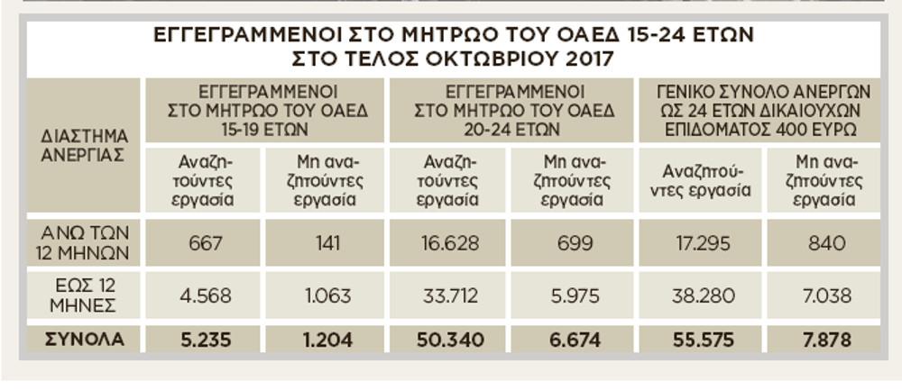 Ακόμη και όσοι δηλώνουν… άεργοι και δεν αναζητούν εργασία κατά δήλωσή τους με την εγγραφή τους στον ΟΑΕΔ παίρνουν το επίδομα των 400 ευρώ που προβλέπει η απόφαση της υπουργού Εργασίας Εφης Αχτσιόγλου με μοναδικό κριτήριο να είναι από 18 έως 24 ετών και μέχρι 3/10/2017 εγγεγραμμένος στα μητρώα ΟΑΕΔ χωρίς να επιδοτείται μέχρι και 19/12/2017.
