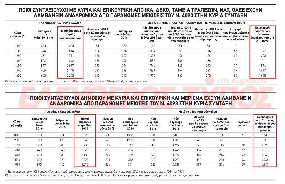 Τα τελικά ποσά που δικαιούνται οι συνταξιούχοι, ανάλογα με το αν έχουν παράνομη μείωση στην κύρια ή και στην επικουρική τους σύνταξη, είναι: